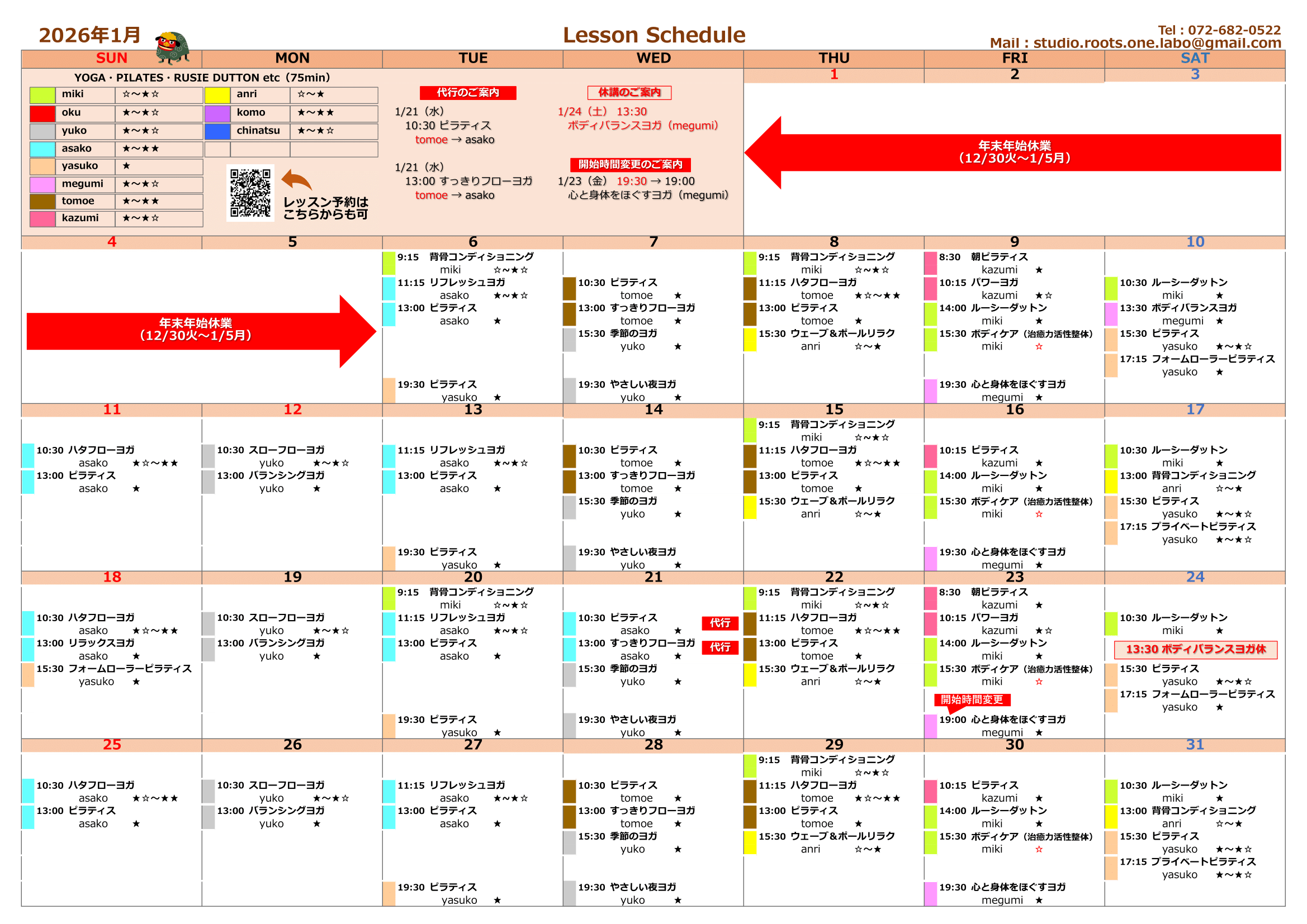 2025年12月7日 / 最終更新日 : 2025年12月7日 admin スケジュール 1月のレッスンスケジュール<NEW> 物価高、米騒動、熊、何かと騒がしかった2025年も終わり新しい年へ。2026年は良い年になればいいですね。引き続き1月も皆様のお越しをお待ちいたしております。 印刷する