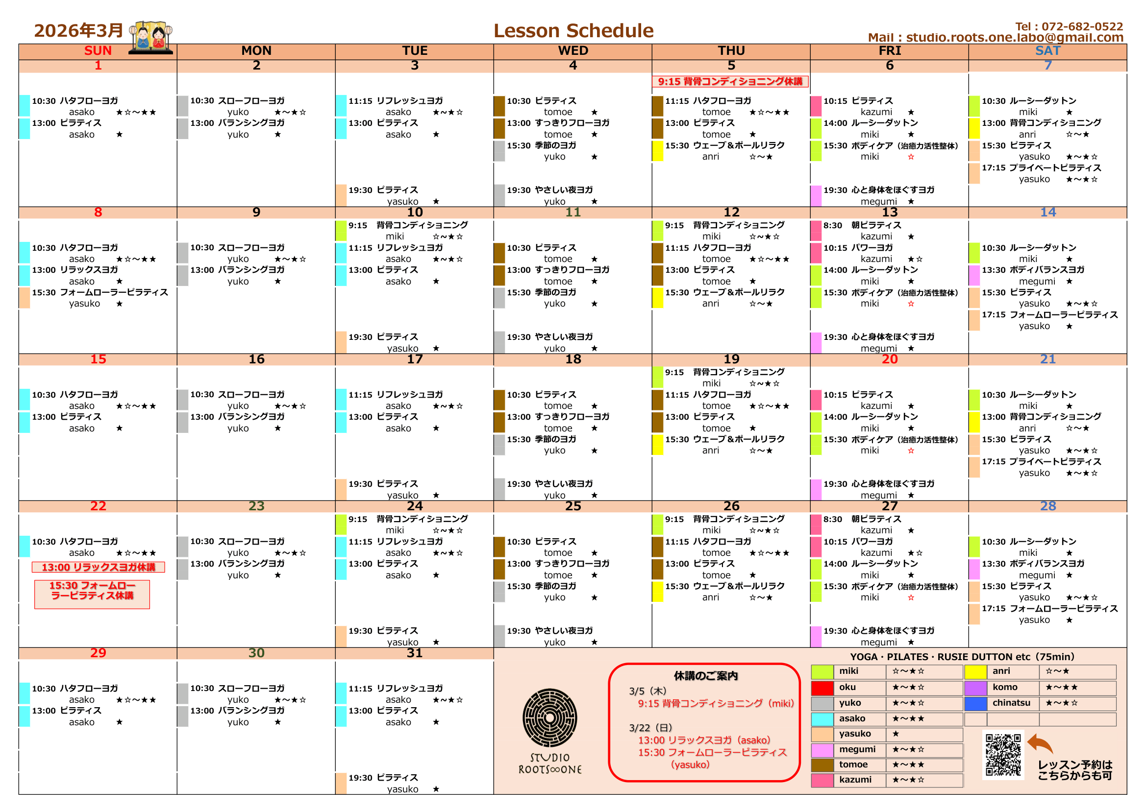 2026年2月4日 / 最終更新日 : 2026年2月18日 admin スケジュール 3月のレッスンスケジュール<NEW> 今年は極端な寒さが続いていますが3月になると少しずつ春の訪れを感じるのでしょうね。3月もスタジオでは皆様のお越しをお待ちいたしております。 印刷する