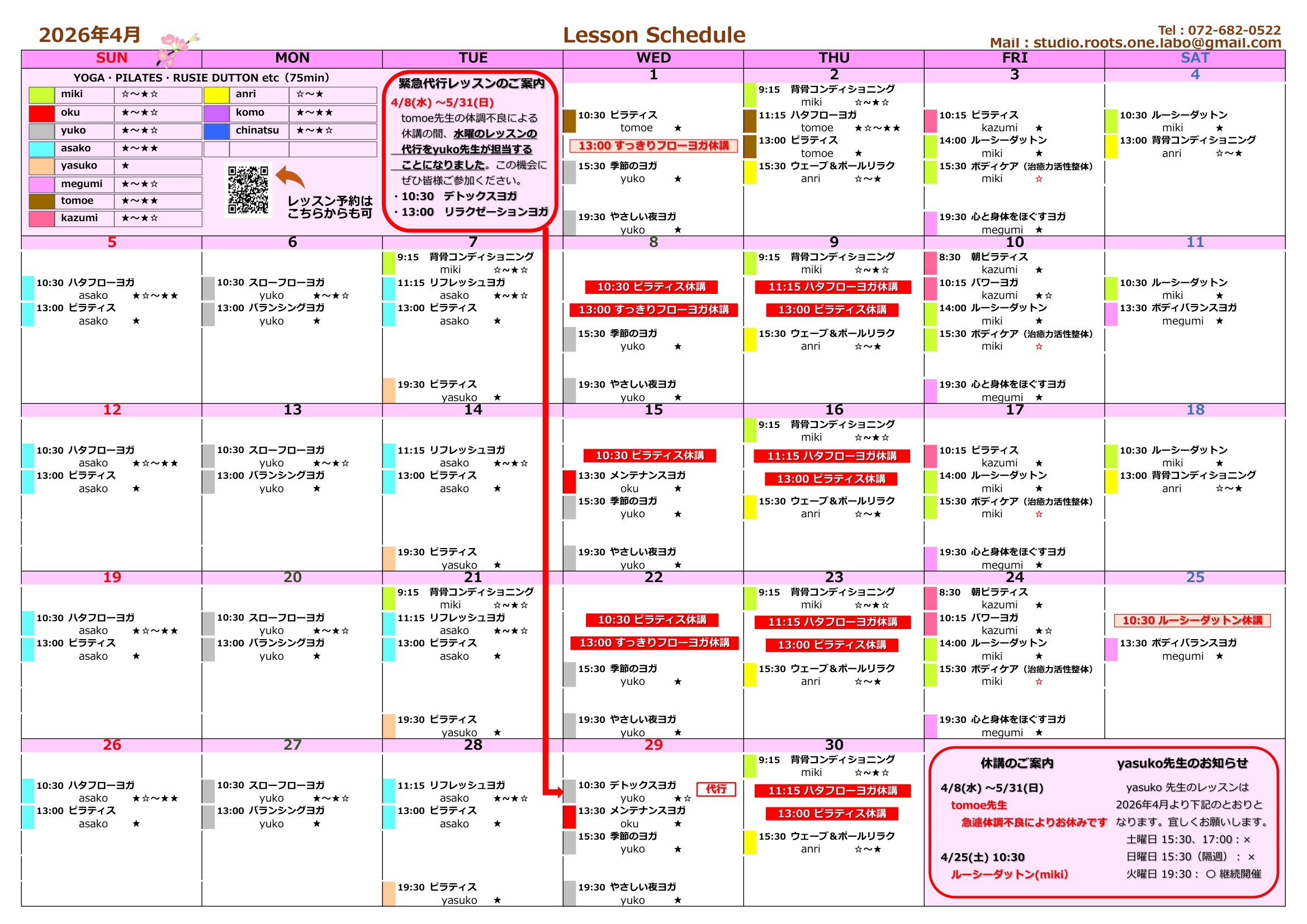 4月のレッスンスケジュール<変更>